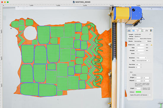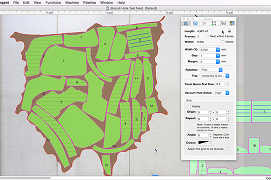 If you're working with small hides or irregular shaped fabric, even offcuts, Aeronaut's Tangent nesting software can autonest into the outlines in one operation, avoiding faults and tears.